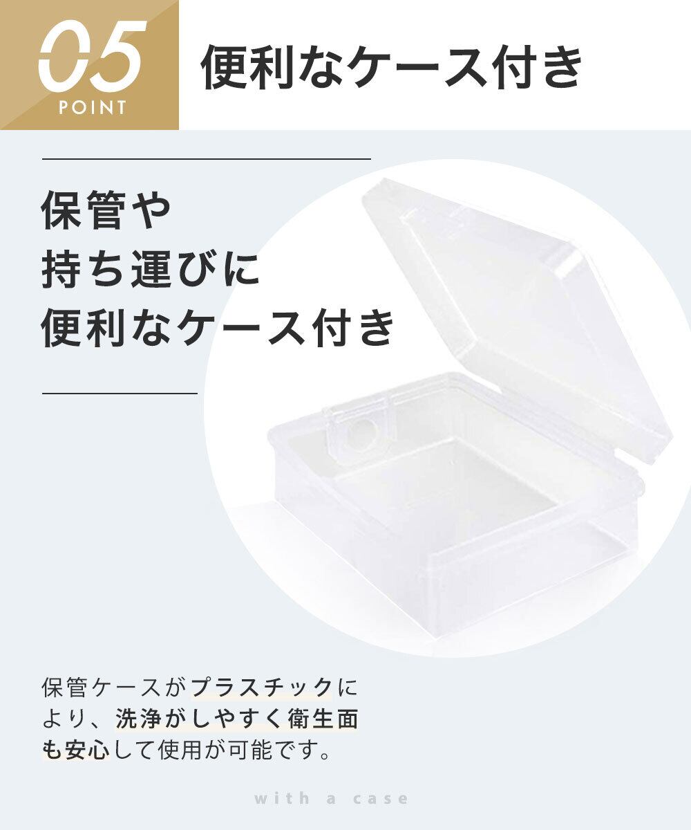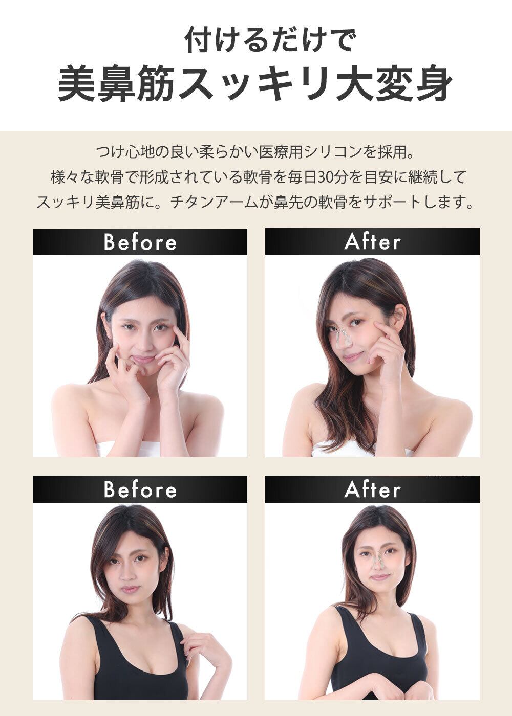 【エステ 美鼻矯正サロン基準 】つけ心地の良い柔らかい医療用シリコンを採用することで、長時間の装着でも痕が付きにくく痛みを抑制。様々な軟骨を美しくカバー。チタンアームの力により鼻先と鼻筋をそれぞれ別々に引き締め可能。金属アレルギーの人でも安心にお使い頂けます。専用ケースもお付けしてますので、旅行先や出張先へも楽々お持ち込みいただけます。