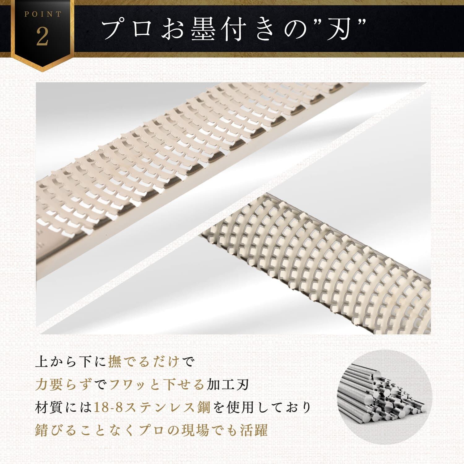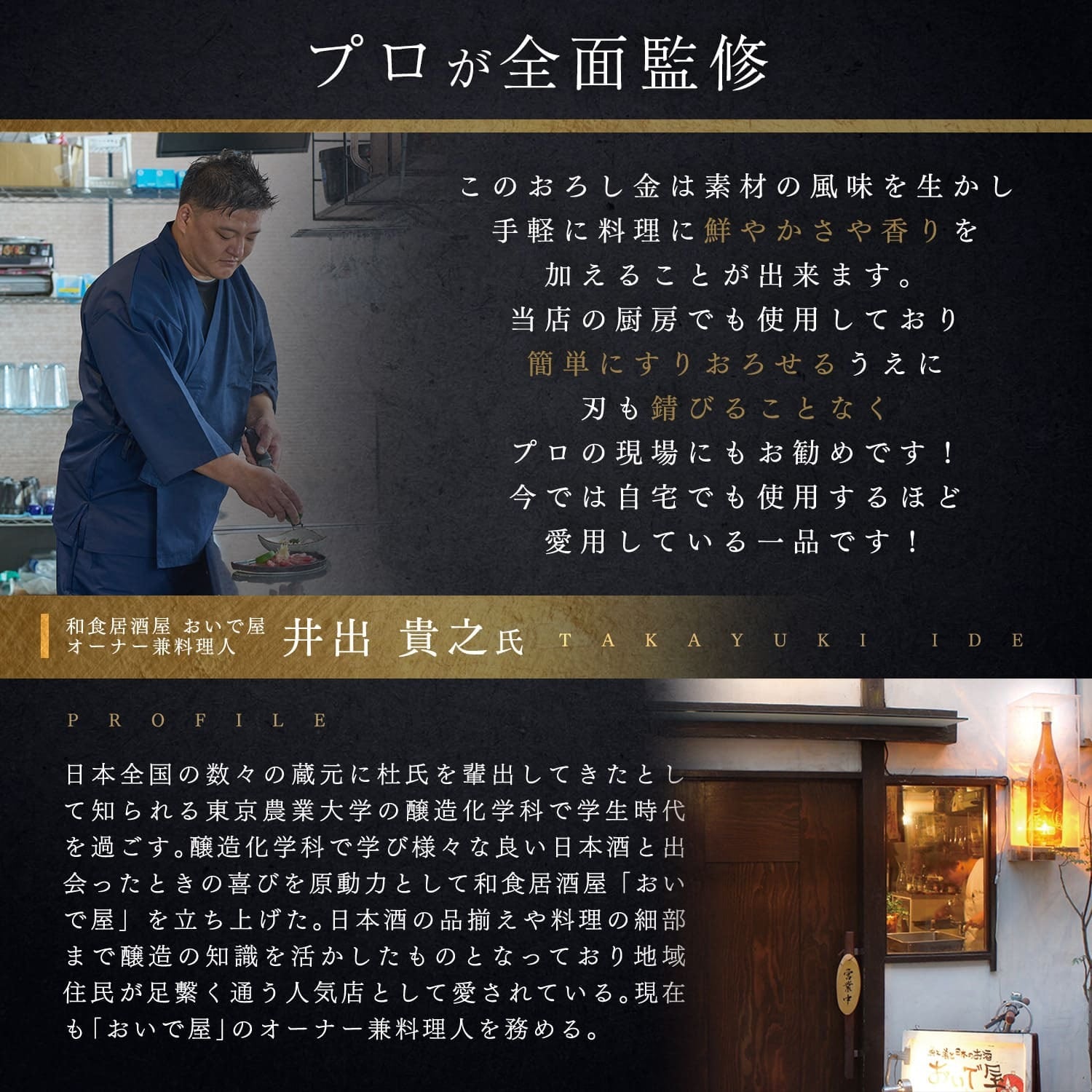■和食のプロ監修のもと刃の材質、形状、柄のデザイン、すべてにこだわりぬいたプロ仕様のおろし金です。
